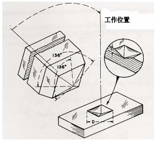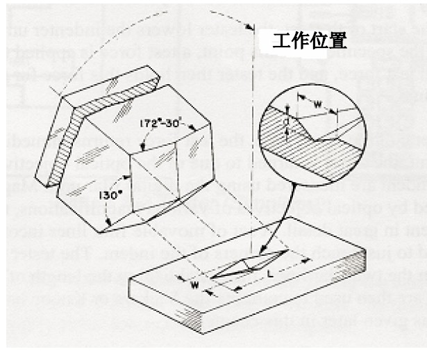 努氏金剛石壓頭的幾何形狀是菱形,其縱向內角是172度30分、橫向內角是130°。由於這個幾何特性,在試驗力較小時也能測得較高精度的對角線。另外,努氏壓痕的深度很淺,約為長對角線的1/30。由於這個特性,努氏硬度計很適用於薄的塗層、表麵硬化層、薄的金屬、金屬薄片、脫碳層和硬的易碎金屬等的硬度。維氏壓頭是麵角136°的正四棱錐金剛石壓頭,可用來測試那些不適宜用努氏壓頭進行測量的材料。但是,由於壓痕深度比較深,維氏硬度計不能像努氏硬度計一樣,適宜測試很薄的金屬薄片。